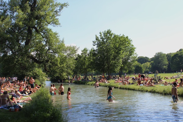 Über die U-Bahnhaltestelle Universität und mit zusätzlichen 5 Minuten Fußweg am Milchhäusl vorbei direkt in den Park, dann sieht man den Eisbach schon (und die anderen 200.000 Sonnenanbeter, die die gleiche Idee hatten).