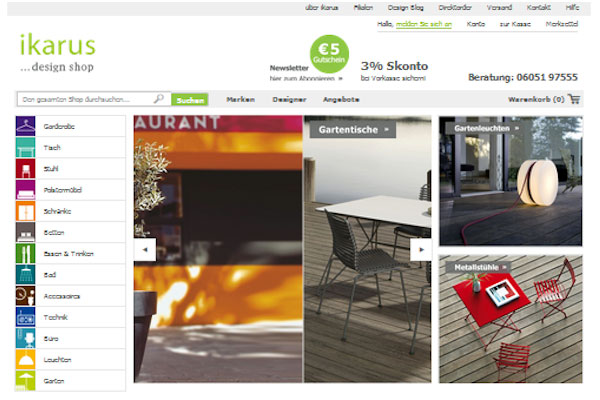Konzentriert in einem Katalog, einem Online-Shop und Ladengeschäften fanden sich bei ikarus Möbel und Artikel für Haus und Garten, Büro, Küche, Bad, Essen und Trinken, Lampen, Bücher und Deko-Accessoires. Über 6000 Artikel waren online bestell- und kurzfristig lieferbar.
