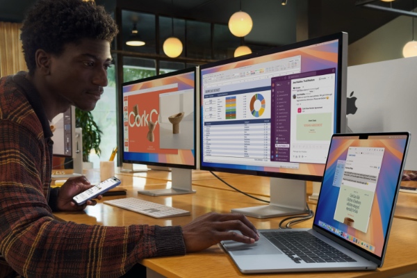 Aus unserer Sicht ein echtes Highlight: Über die beiden Thunderbolt-Schnittstellen lassen sich zwei HDMI-Monitore anschließen. Zusammen mit dem integrierten Display des MacBooks stehen damit drei Bildschirme zur Verfügung, die parallel unterschiedliche Inhalte anzeigen können. Das macht richtig Spaß und bringt eine tolle Performance beim Arbeiten am Bildschirm.